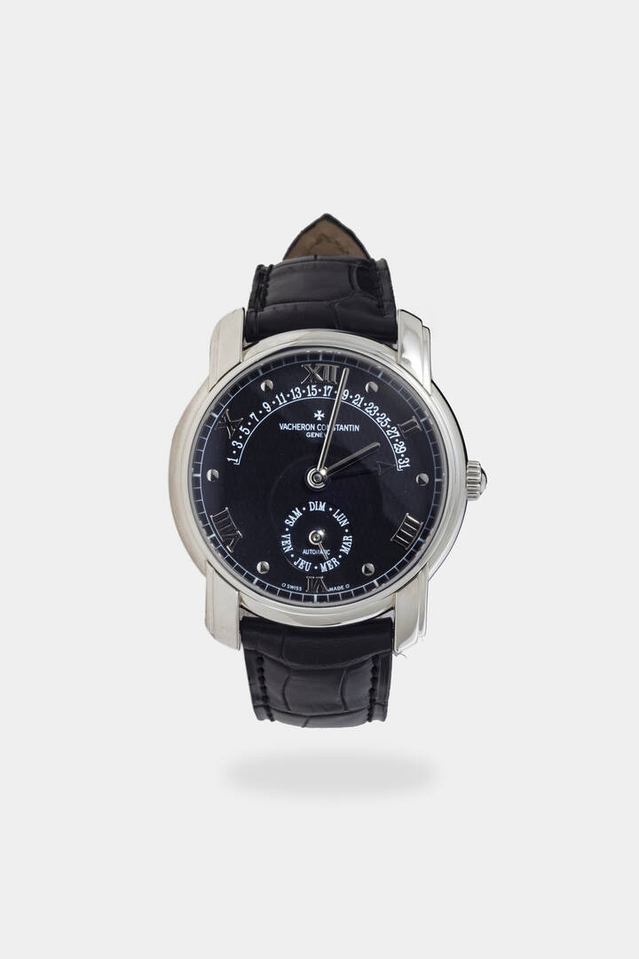 Diam. 37 mm Cassa in platino con fondello in vetro ed anse lavorate. Quadrante antracite con numeri romani intervallati da indici applicati. Presente ad ore 12 serigrafati a mezzaluna i 31 giorni del mese mentre ad ore 6 troviamo il sub-contatore dei mesi dell'anno. Movimento a carica automatica 1126. Orologio in condizioni esemplari. Corredato da scatola controscatola libretti recanti targhetta ripetitrice dei numeri di serie dell'orologio.