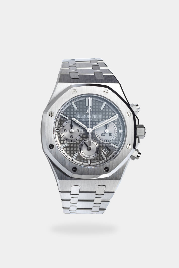 Diam. 39 mm Cassa in acciaio con tipica forma ottagonale e bracciale a maglie integrato. Quadrante grigio lavorato guilloché con indici geometrici luminescenti applicati. Presente al 6 il sub contatore dei secondi continui al 9 quello delle 12 ore ed al 3 quello dei 30 minuti. Ad ore 5 troviamo la finestrella della data. Movimento a carica automatica 2385. Orologio completo di scatola e garanzia card. Probabilmente mai indossato