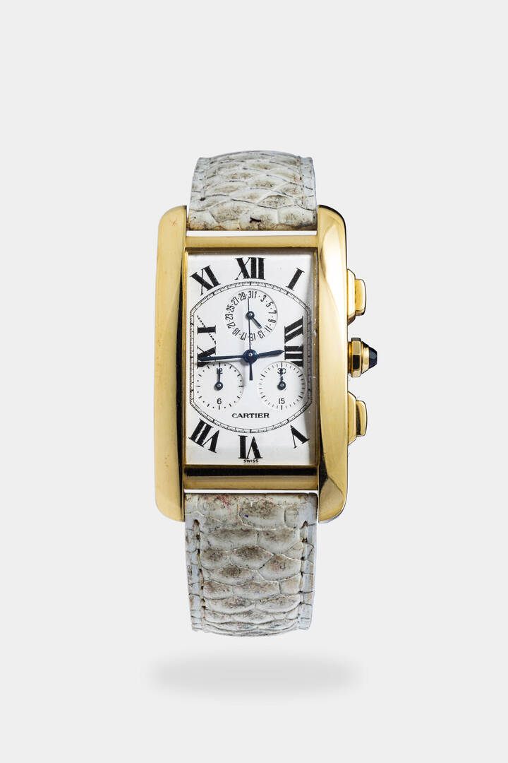 27x45 mm Cassa in oro di forma. Quadrante bianco con numeri romani serigrafati indicazione della data al 12 dei 30 minuti cronografici al 4 e delle 12 ore al 8. Movimento al quarzo. Orologio full set completo di scatola e garanzia.