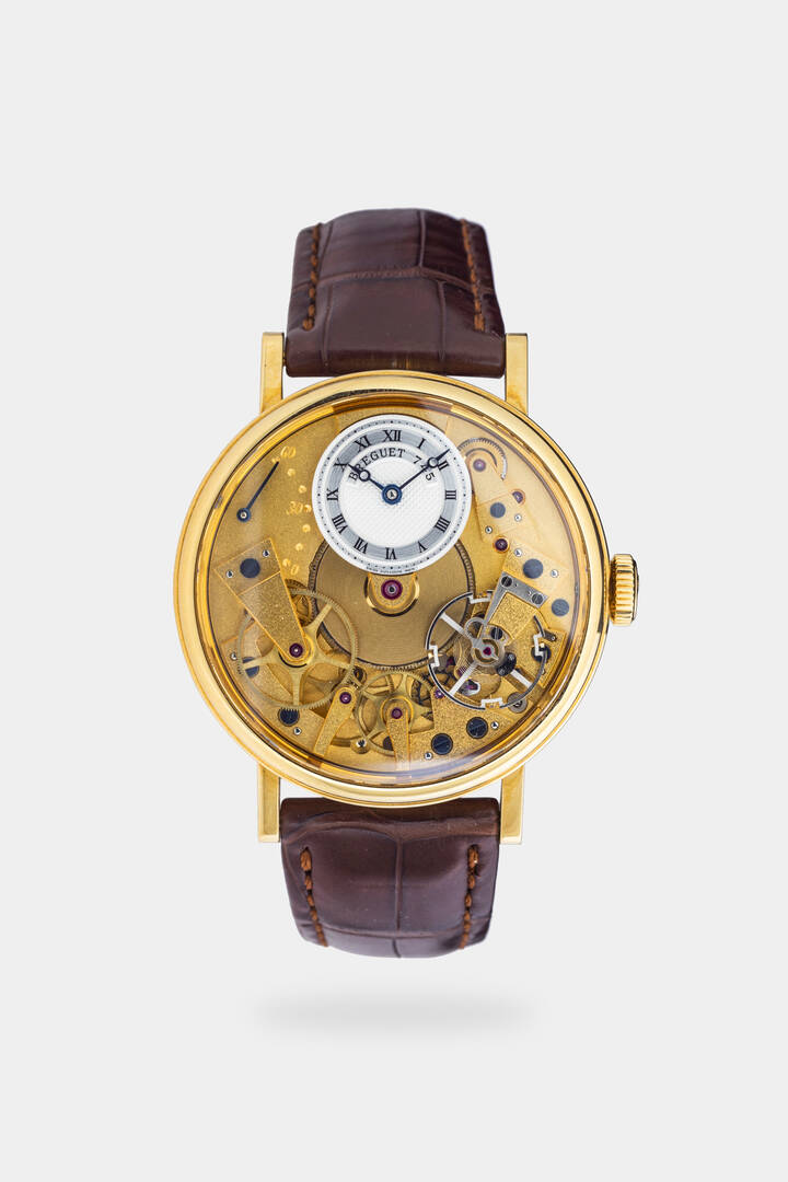Diam. 39 mm Cassa in oro con carrure lavorata e fondello trasparente. Quadrante bianco con lavorazione guilloché e numeri romani serigrafati. Presente parte scheletrata che lascia intravedere il meccanismo di nobile fattura e l'indicazione dei secondi continui al 10. Movimento a carica automatica cal.505SR. Orologio nuovo completo di garanzia scatola e libretti.