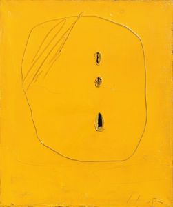 Olio, buchi e graffiti su tela, giallo, cm. 55x46 1961 Firma in basso a destra: L. Fontana; firma e titolo al [..]