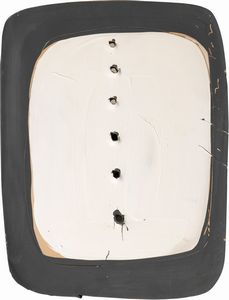 Buchi e graffito su terracotta colorata a freddo, bianco e grigio, cm. 26,1x34 Firma in basso a destra: L. Fon [..]