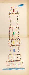 Litografia e tecnica mista su carta, cm. 52,8x20,8 1984 Scritta, firma e data in basso al centro: Auguri 1985 [..]