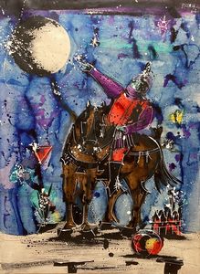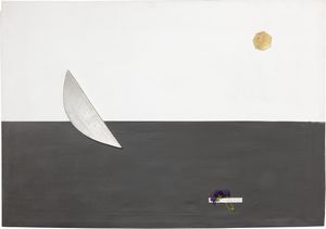 Acrilico e assemblaggio su tela, cm. 71x100,5 1977 Titolo, firma e data al verso sulla tela: Colloquio - Luna [..]