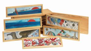Serie di sei acquerelli in cornice entro scatola di legno, cm. 8x25,8 ognuno (con cornice), cm. 10x28,8x15 (scatola) [..]
