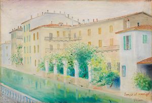 Olio su tela, cm. 49,8x73,2 Titolo e firma in basso a destra: Lungo il Naviglio / Lilloni; dedica al verso sulla [..]