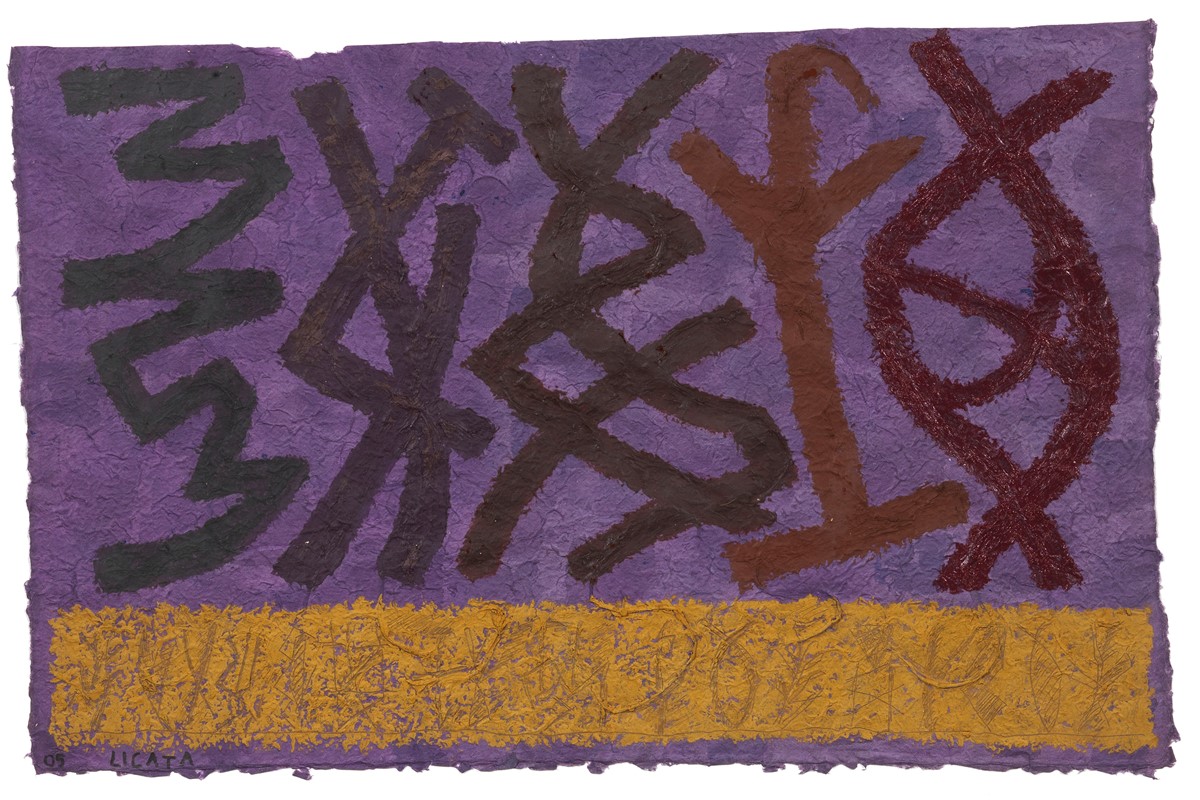 2005 Data e firma in basso a sinistra: 05 Licata; titolo, firma e data al verso su un cartone di supporto: Geroglifici 05 Graffiti / R. Licata / 2005:
