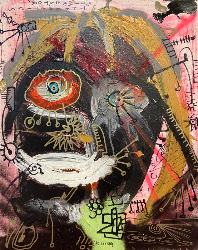 Olio e tecnica mista su tela, cm. 76x60,8 Firma in basso al centro: Paul Kostabi; firma, titolo e data al verso sulla tela: Paul Kostabi / Siim Nestor / 2008; sul telaio: etichetta Comune di Corbetta / Esposto dal 10.5 al 2.6.2008 / Pubblicato su Paul Kostabi / 2008 - Ed. Galleria Brera1.