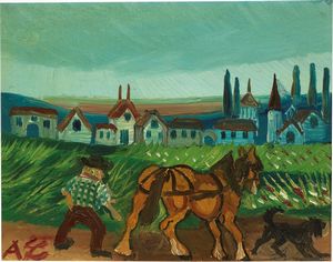 Tempera, tempera diluita e matita grassa su carta applicata su tela, cm. 30x21 1947 ca. Firma in basso a sinistra: [..]