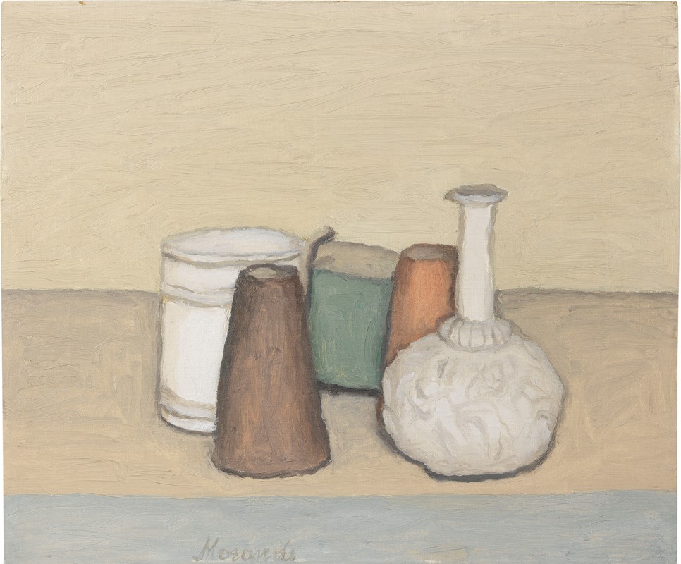 Olio su tela, cm. 36x43 1952 Firma al centro verso sinistra: Morandi. Al verso sul telaio: etichetta Acquavella Galleries, New York; su un cartone di supporto: etichetta Brescia Mostre Grandi Eventi / Palazzo Martinengo / Mostra Morandi - oggetti e stati d'animo / 07.12.96 - 02.03.97, con n. 195Z: etichetta Mr. and Mrs. Henry R. Luce Collection: etichetta Galleria dello Scudo, Verona: etichetta con dati dell'opera e indicazione Mostra Morandi in Giappone.