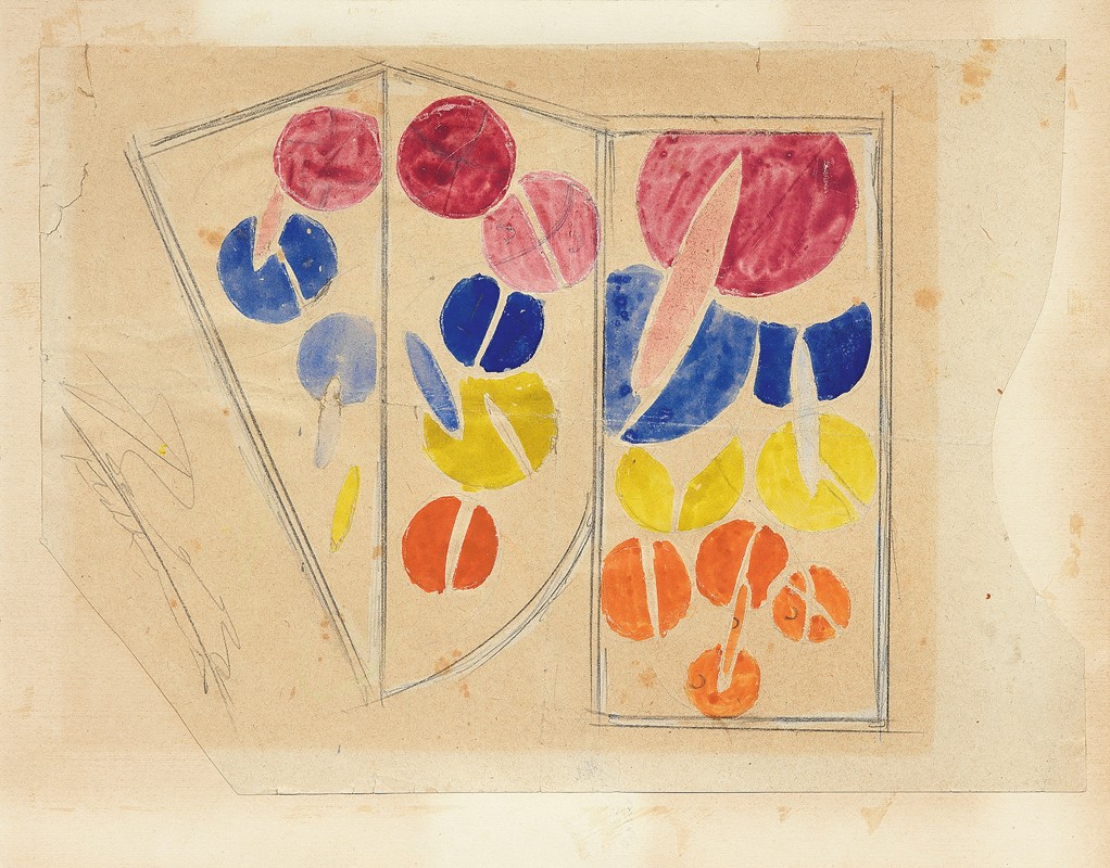 Tecnica mista su carta applicata su cartone, cm. 21x27 1916 ca. Firma sul lato sinistro: Balla / Futurista. Su un cartone al verso della cornice: scritta di Luce Balla Giacomo Balla / Bozzetto per paravento - 1916: etichetta di Casa Balla, con n. 767: etichetta Galleria Edieuropa QUIarte Contemporanea, Roma, con n. 47.