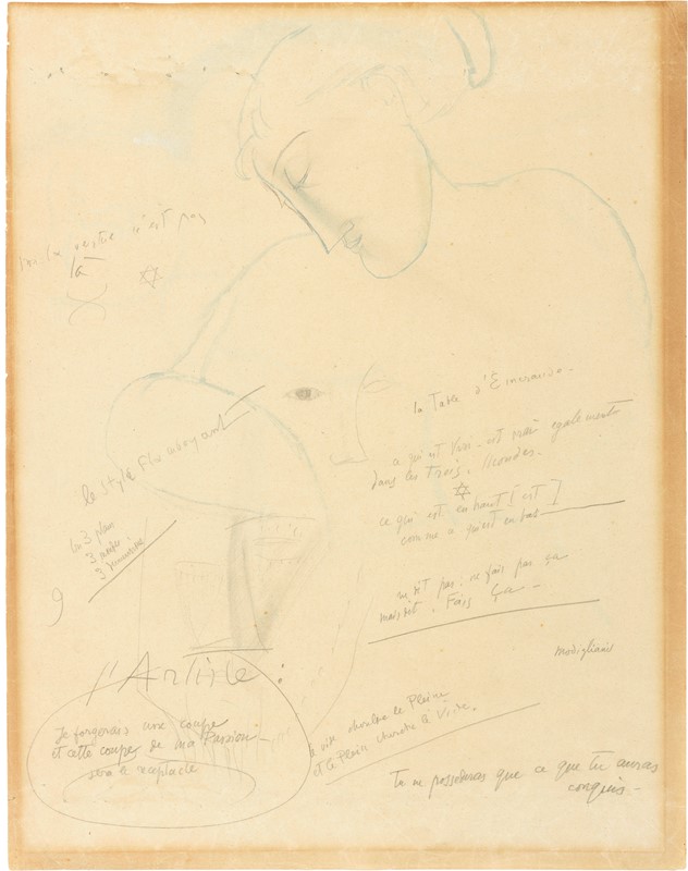1915 Firma in basso a destra: Modigliani, iscrizioni varie lungo tutto il foglio: La vertue n’est pas là / le Style flamboyant / 9: les 3 Plans 3 mondes 3 dimensions / l’Artiste: Je forgerai une coupe et cette coupe sera le receptacle de ma Passion / la table d’Emeraude / Ce qui est vrai, est vrai également dans les trois Mondes. / ce qui est en haut (est) comme ce qui est en bas / Ne dit pas: ne fais pas ça, mas dit: Fais ça / Le vide cherche le Plein et le Plein cherche le Vide / tu ne possederas que ce tu auras conquis; al verso: studio di nudo maschile a gouache.