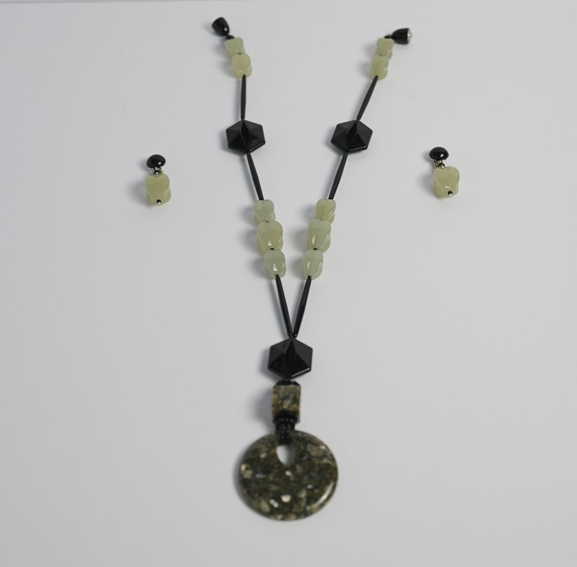 Long necklace and earrings in black and light green resin with round pendant.