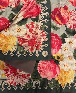 SALVATORE FERRAGAMO Trapunta quadrata in seta con stampa floreale su fondo verde, in cm 134x134. Square silk [..]