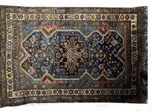 ELISABETTA GIRALDI MASSIMEO Tappeto Shiraz a fondo blu con campo sagomato e decorato da medaglione scalettato [..]