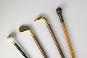DA DISPOSIZIONE EREDITARIA Serie di 4 bastoni con prese in ceramica con fiori, ottone con teste di volatile [..]