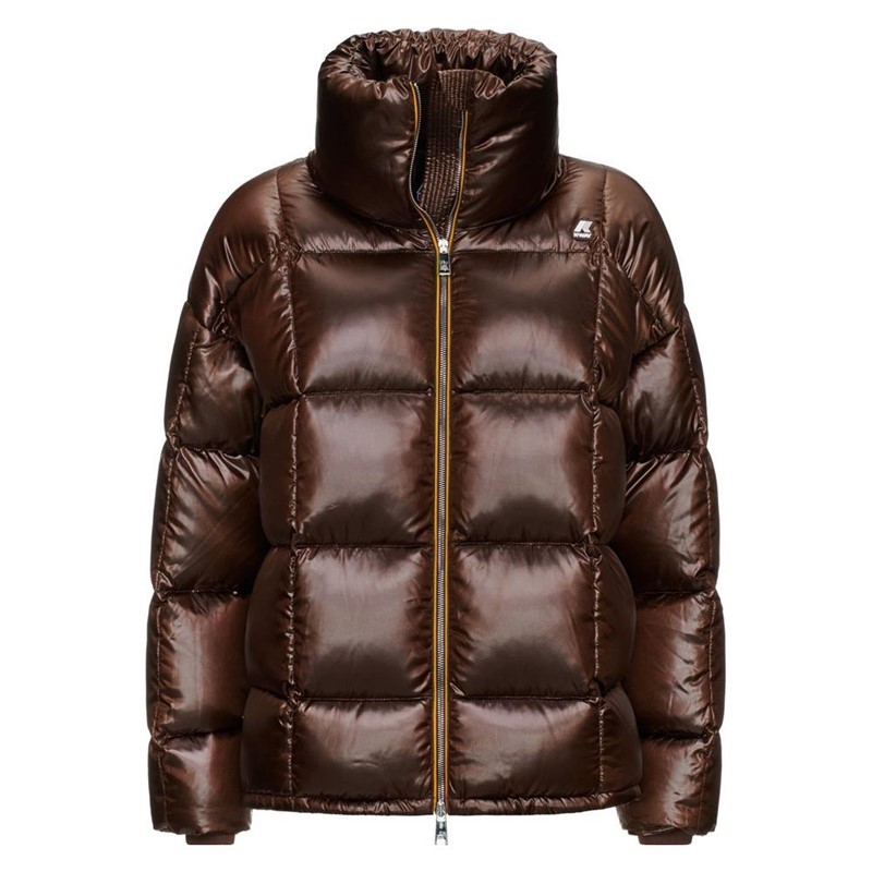 Silas Heavy thermo Igloo. Giacca Kway da donna passepartout, relizzata in tessuto tecnico cangiante con trapunta grafica ispirata alla superficie degli igloo, imbottitura soffice in vera piuma, collo alto e bordi strech, colore marrone.