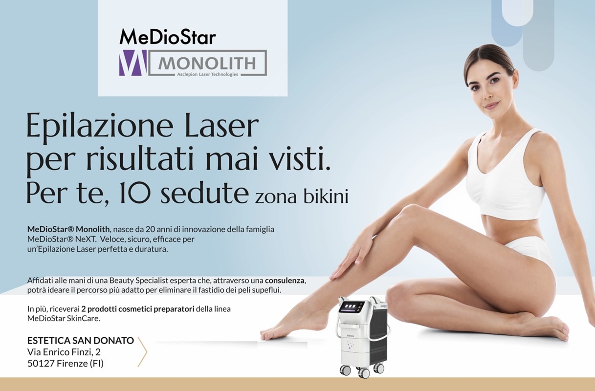 10 hair removal sessions at Estetica San Donato in Florence, with the cutting-edge MedioStar Monolith technologies. To be redeemed by November 2023, on a date to be agreed.