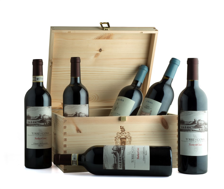 Torre a Cona Complete Wine Selection Colorino Casamaggio IGT 2018 2 bottiglie da 750 ml Merlot IGT 2017 2 bottiglie da 750 ml Badia a Corte Chianti Colli Fiorentini Riserva DOGG 2017 2 bottiglie da 750 ml Entro cassetta in legno