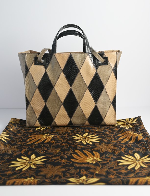 Shopping bag in Whips (aquatic reptile), beige / black patchwork color, with adjustable and removable shoulder strap. Leather interior with zip pocket and button closure. Resin shoulder strap loops. 40x12x30 cm Complete with personalized dustbag.