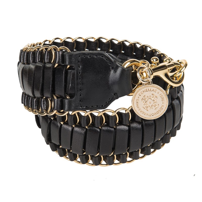 Rolling Circle Belt and Shoulder Strap - Ladies belt in shiny black cowhide braided with brass rings old gold finishing, cm 80.
