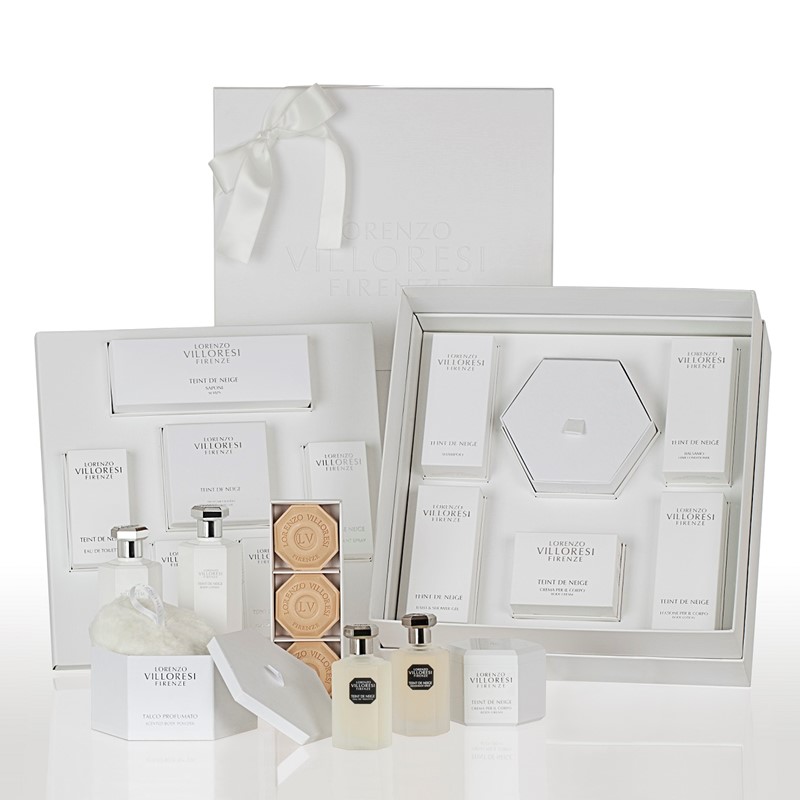 The Gift set from the Teint de Neige collection, includes: - Solid Perfume in metal gift case 10 gr - Eau de Toilette 100 ml - Eau de Parfum 50 ml - Hair Mist 50 ml - Deodorant spray 100 ml - Soap 100 gr x 3pcs - Body Cream 200 ml - Body Lotion 250ml - Scented Body Powder 200gr - Bath&Shower Gel 250ml - Shampoo 250 ml - Hair Conditioner 250 ml