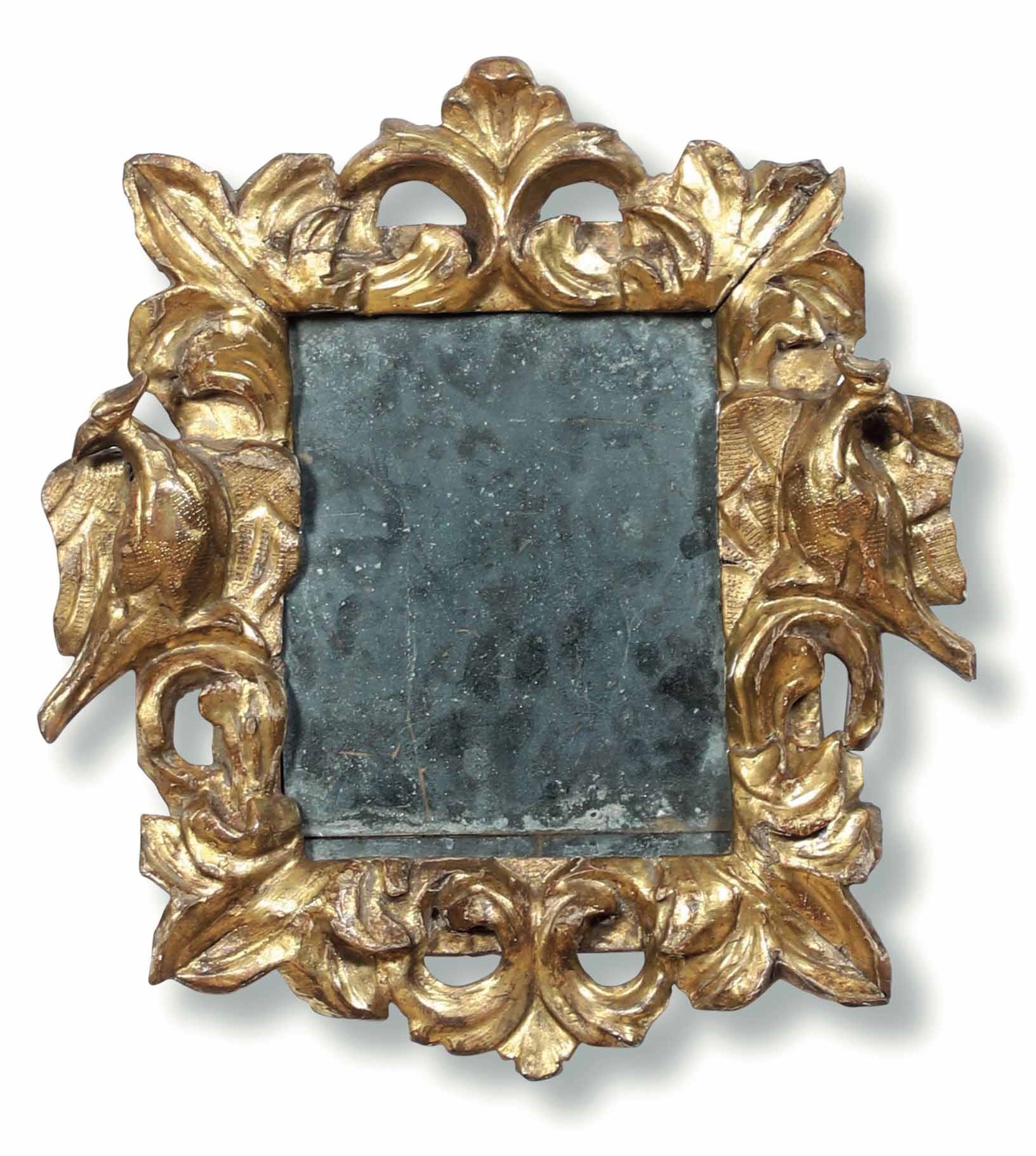 Cornice a cartoccio in legno riccamente intagliato e dorato. Veneto XVII secolo