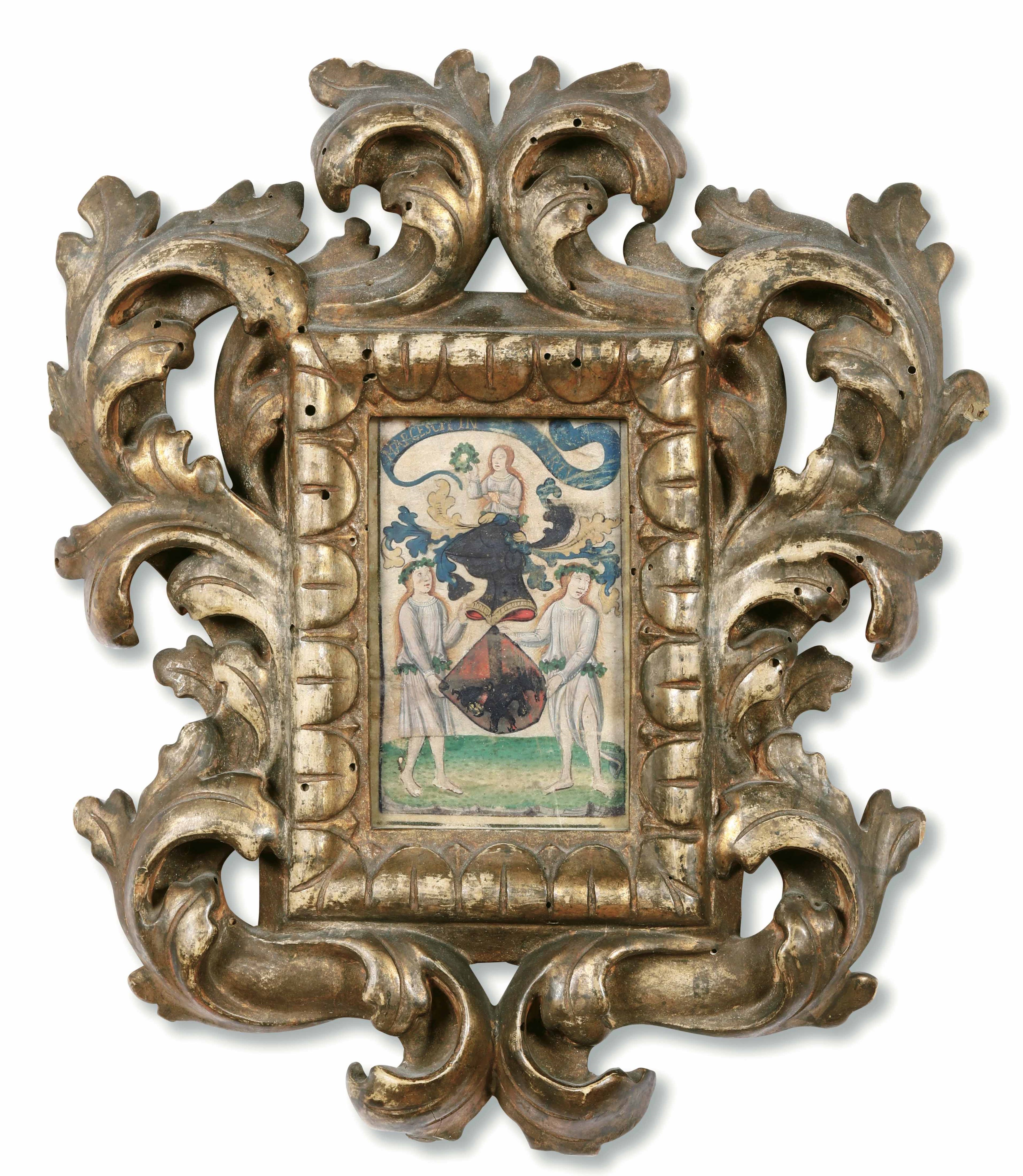 Cornice a cartoccio riccamente intagliata a mecca, Italia centrale XVII secolo