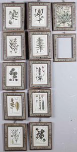 Dodici cornici in legno laccato e decorato a motivi floreali