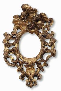 Importante cornice a cartoccio in legno intagliato e dorato. Venezia XVII secolo