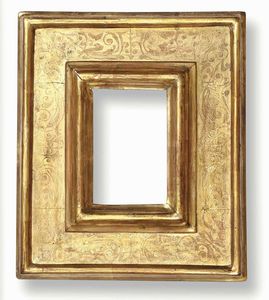 Cornice a cassetta dorata a fascia riccamente intagliata a motivi floreali. Toscana [..]