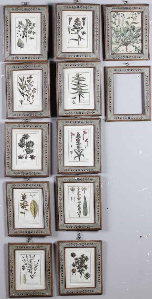 Dodici cornici in legno laccato e decorato a motivi floreali