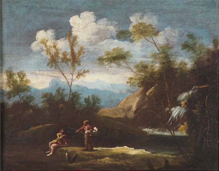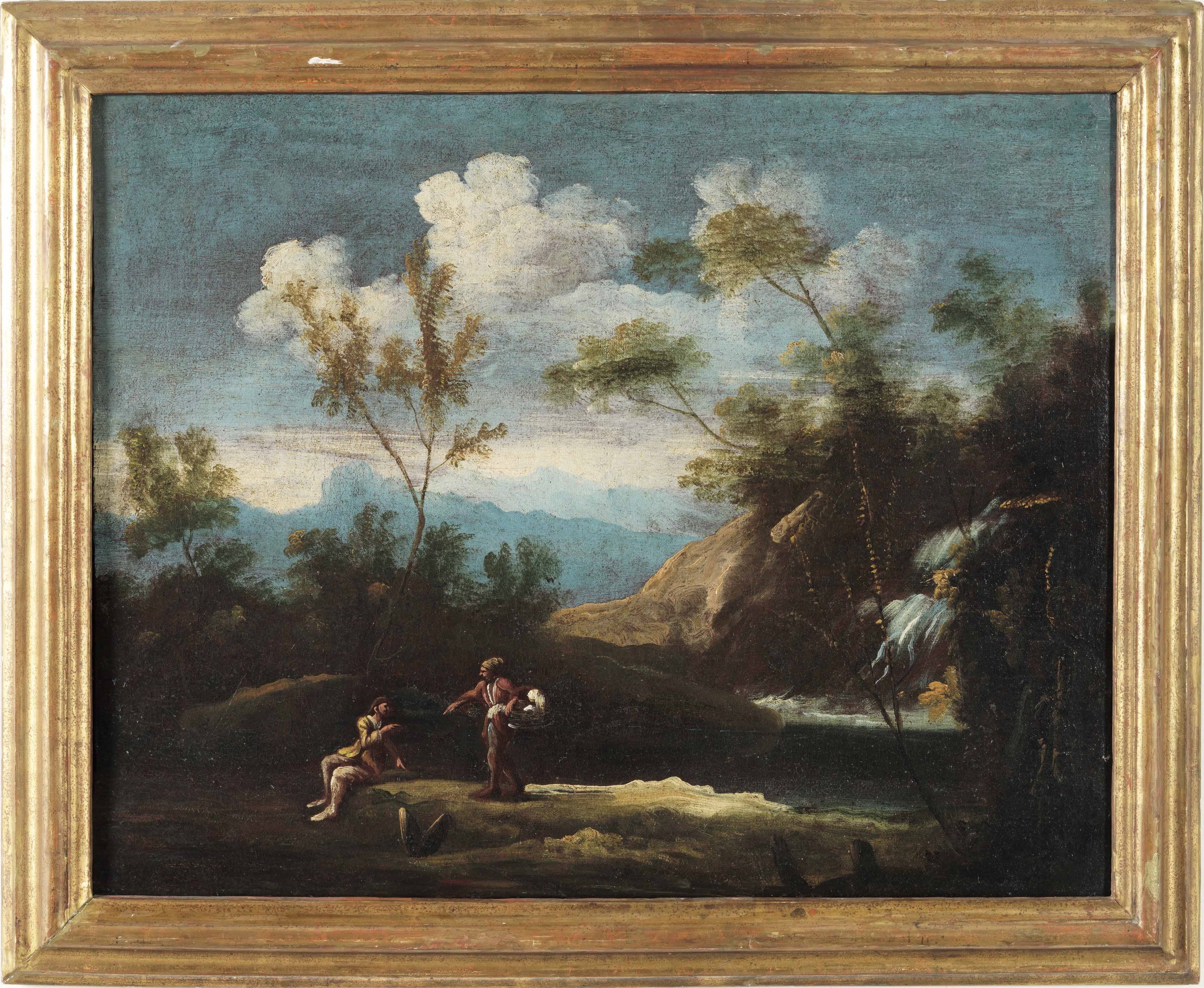 Paesaggio con cascata e personaggi