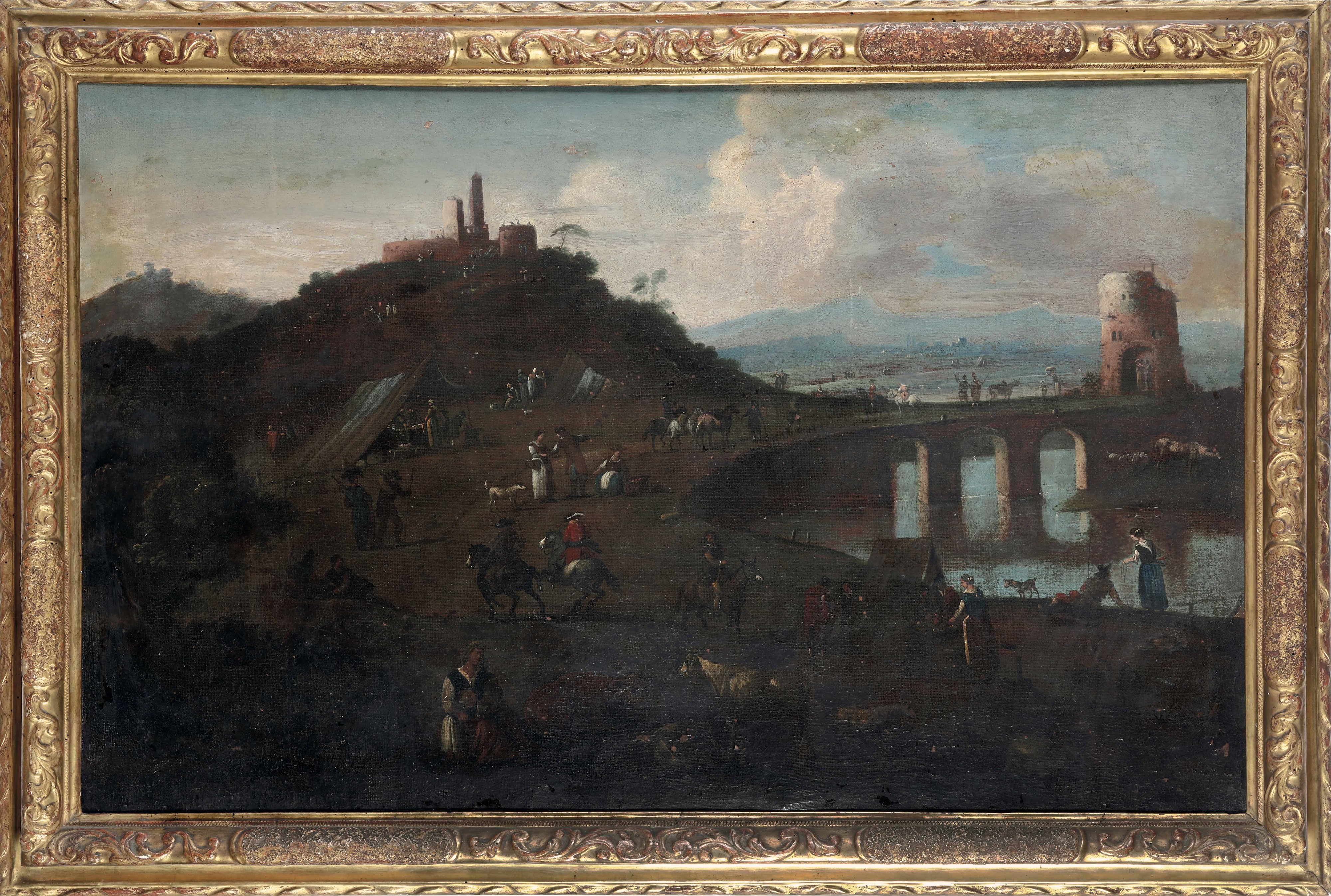 Paesaggio con personaggi in riva al fiume e cittadella sullo sfondo