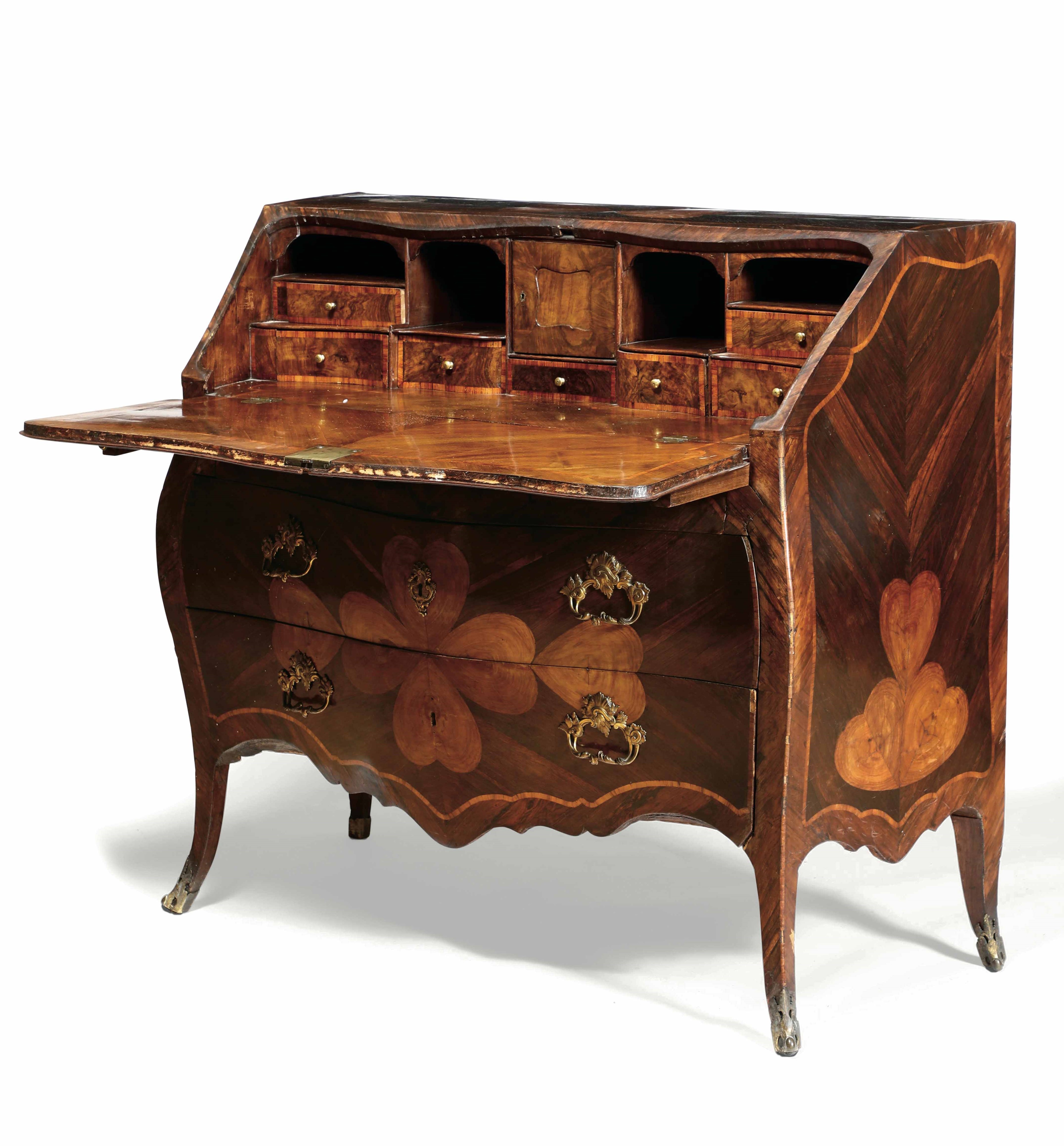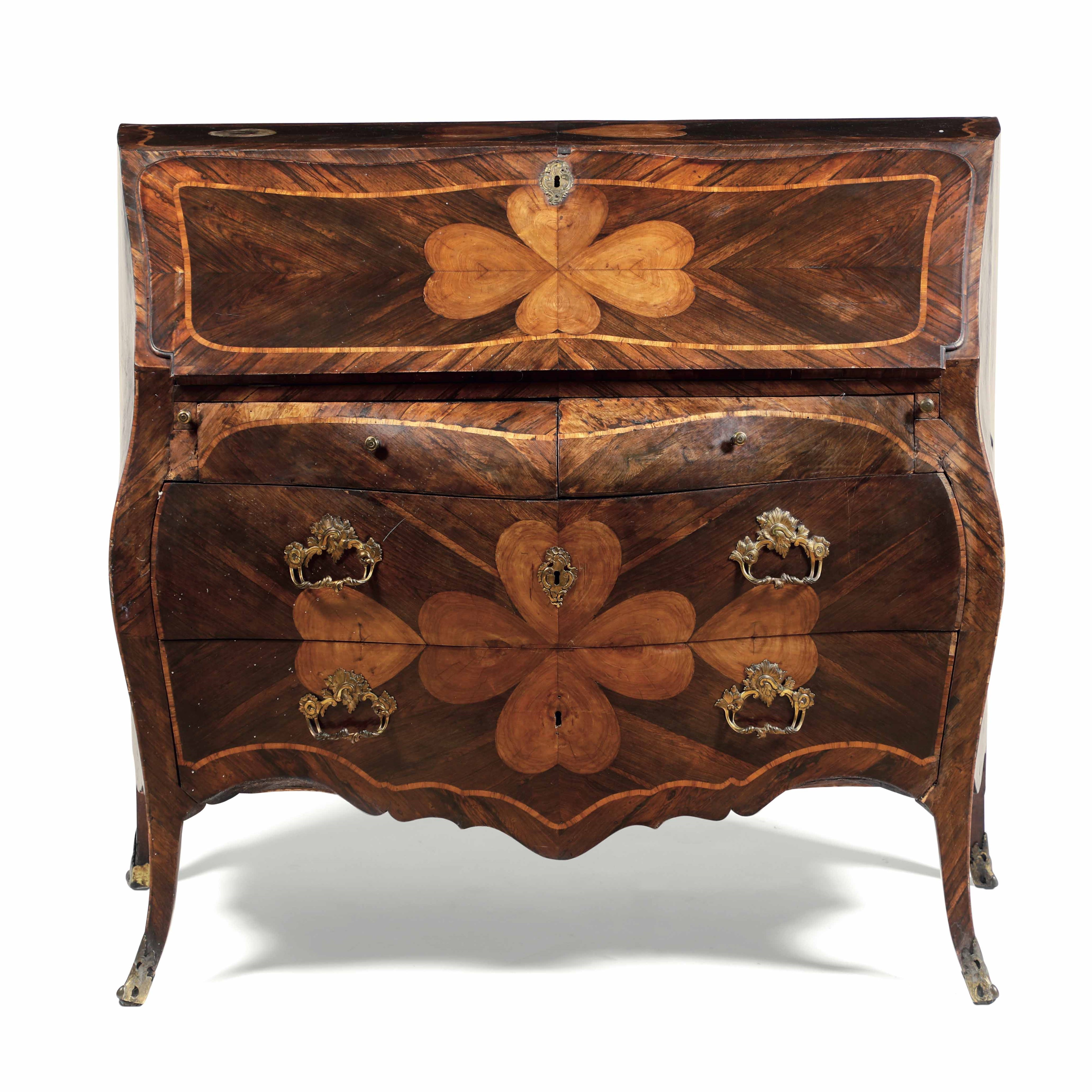Bureau Luigi XV lastronato in palissandro con quadrifogli e filettature in bois [..]