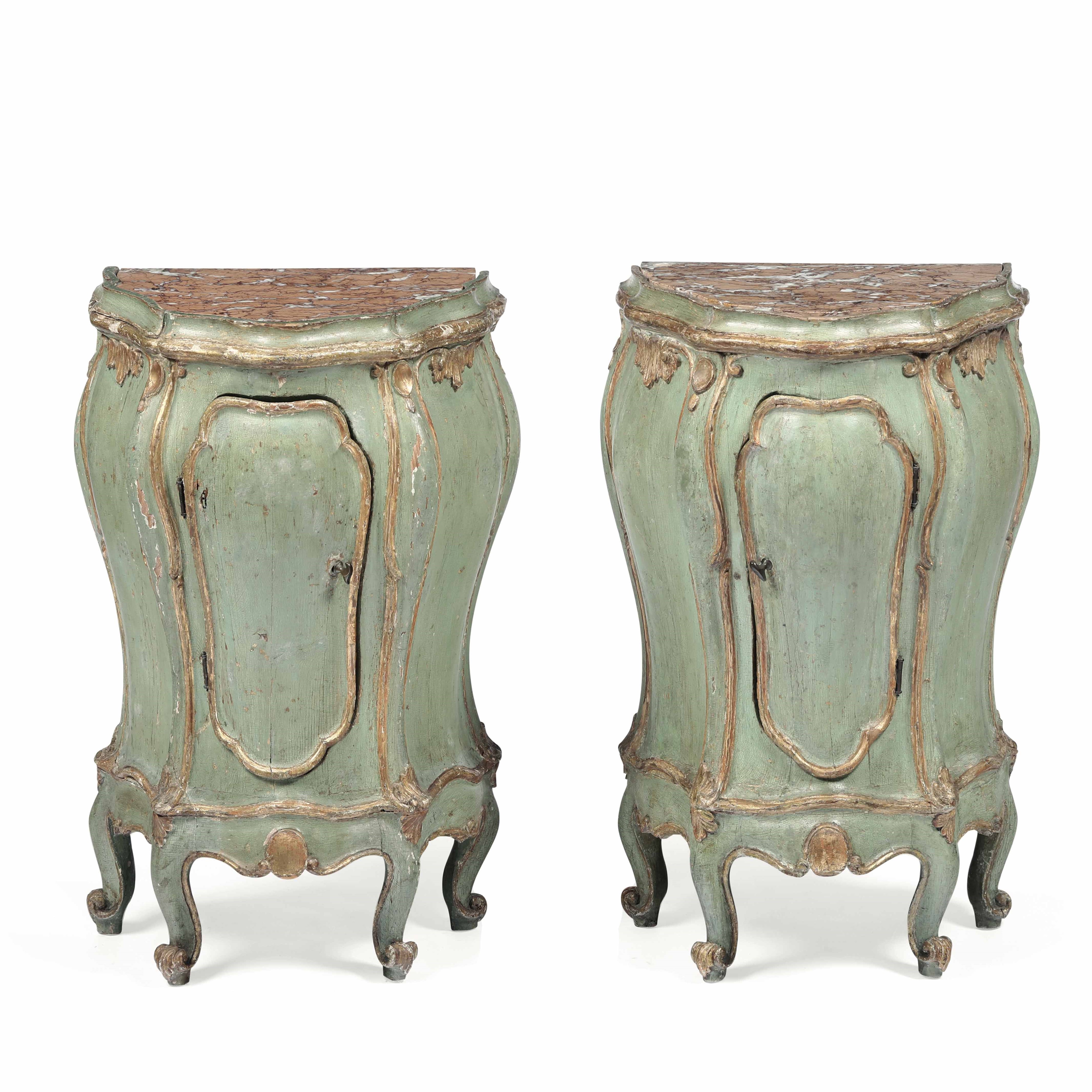 Coppia di comodini Luigi XV bombati in legno laccato. Venezia XVIII secolo