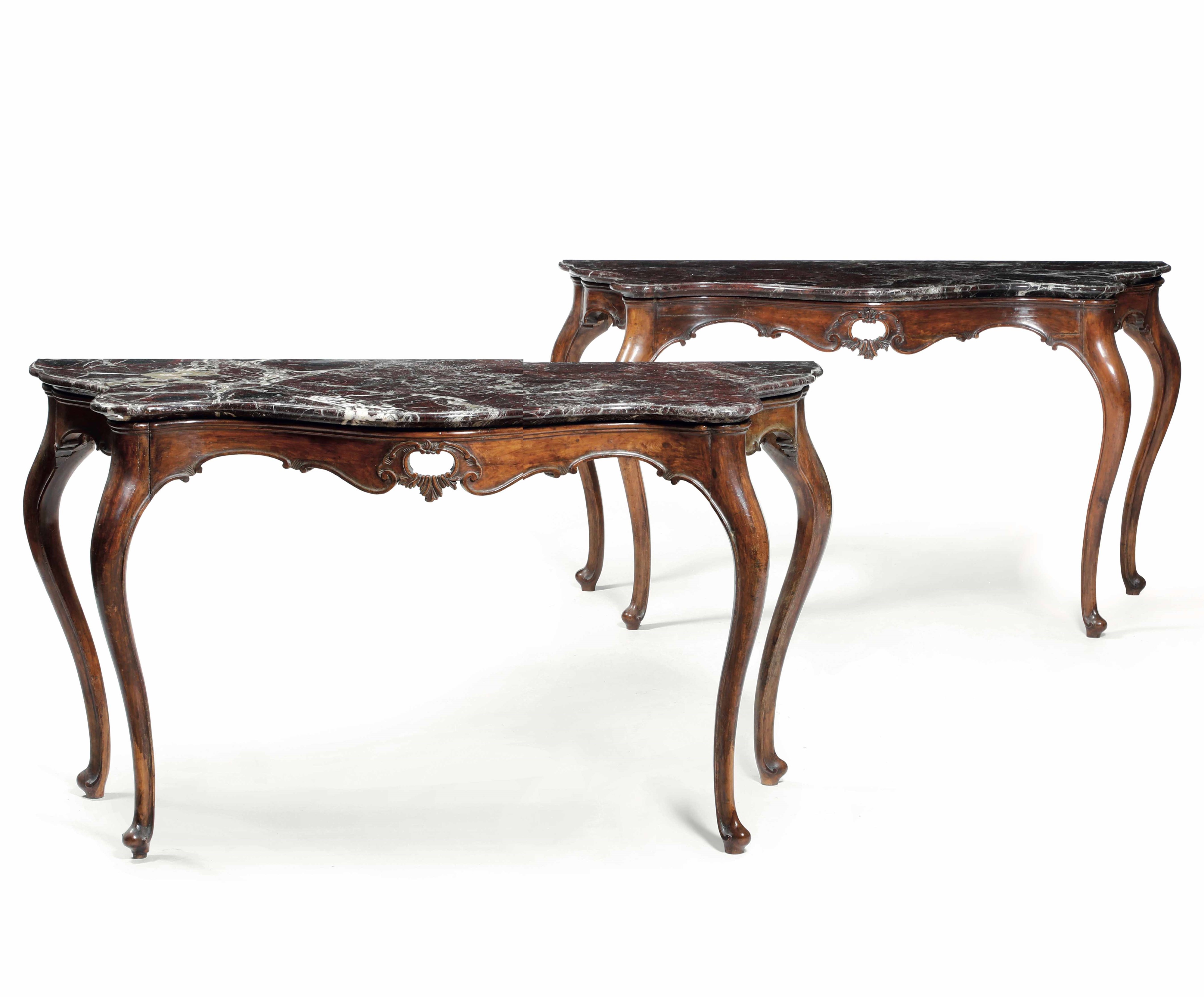 Coppia di consolles in legno di forma mossa con fascia intagliata e traforata. Veneto, [..]