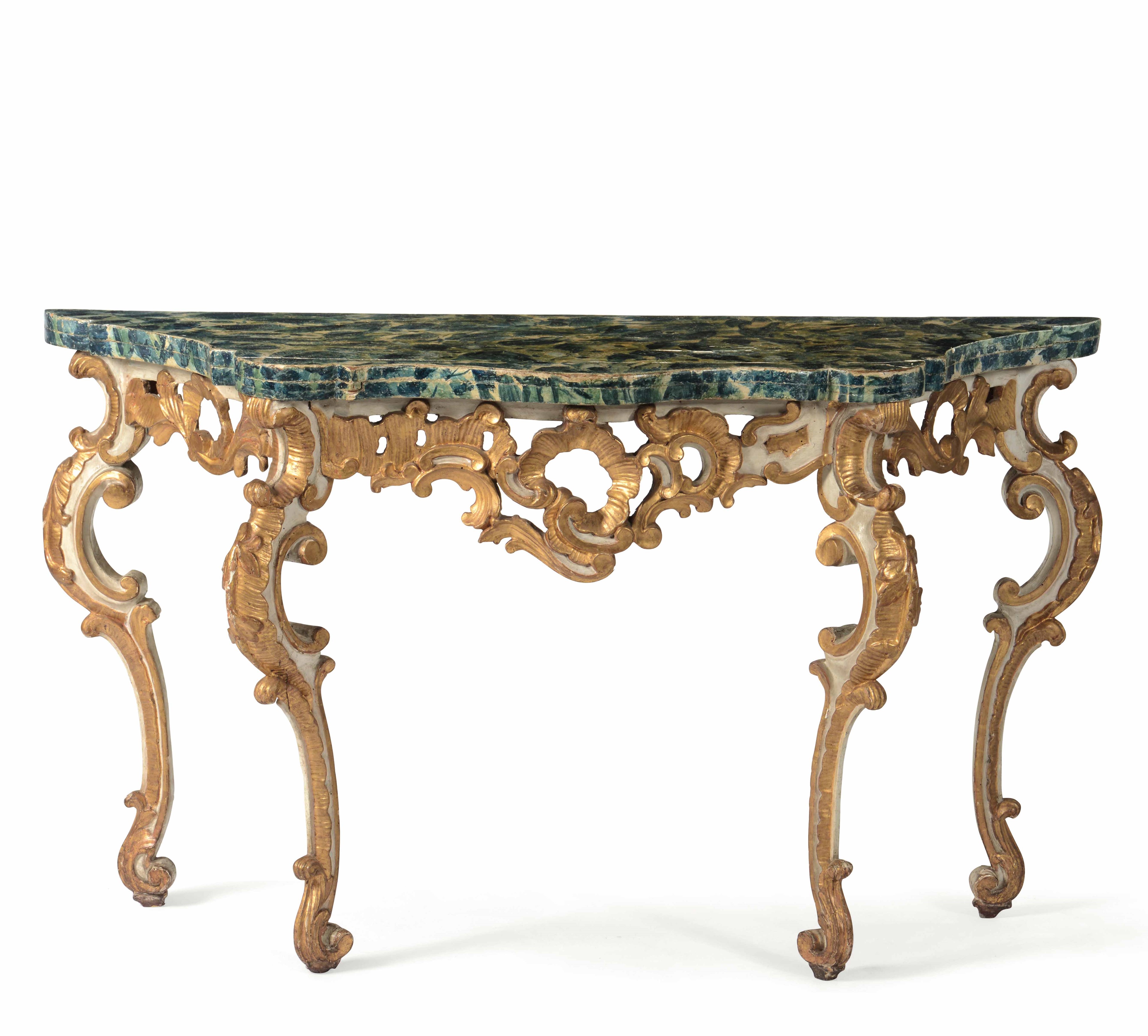 Coppia di consolles in legno intagliato, dorato, laccato e dipinto. Italia centrale, [..]