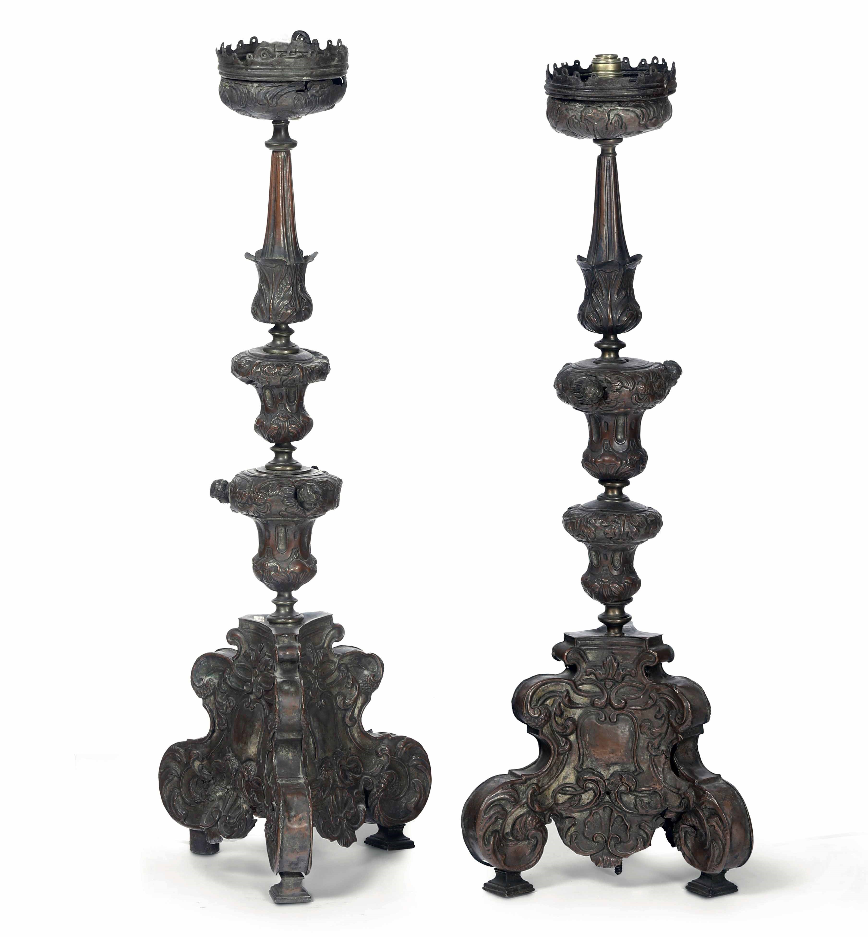 Coppia di grandi torciere in rame sbalzato con anima in legno. XVIII secolo