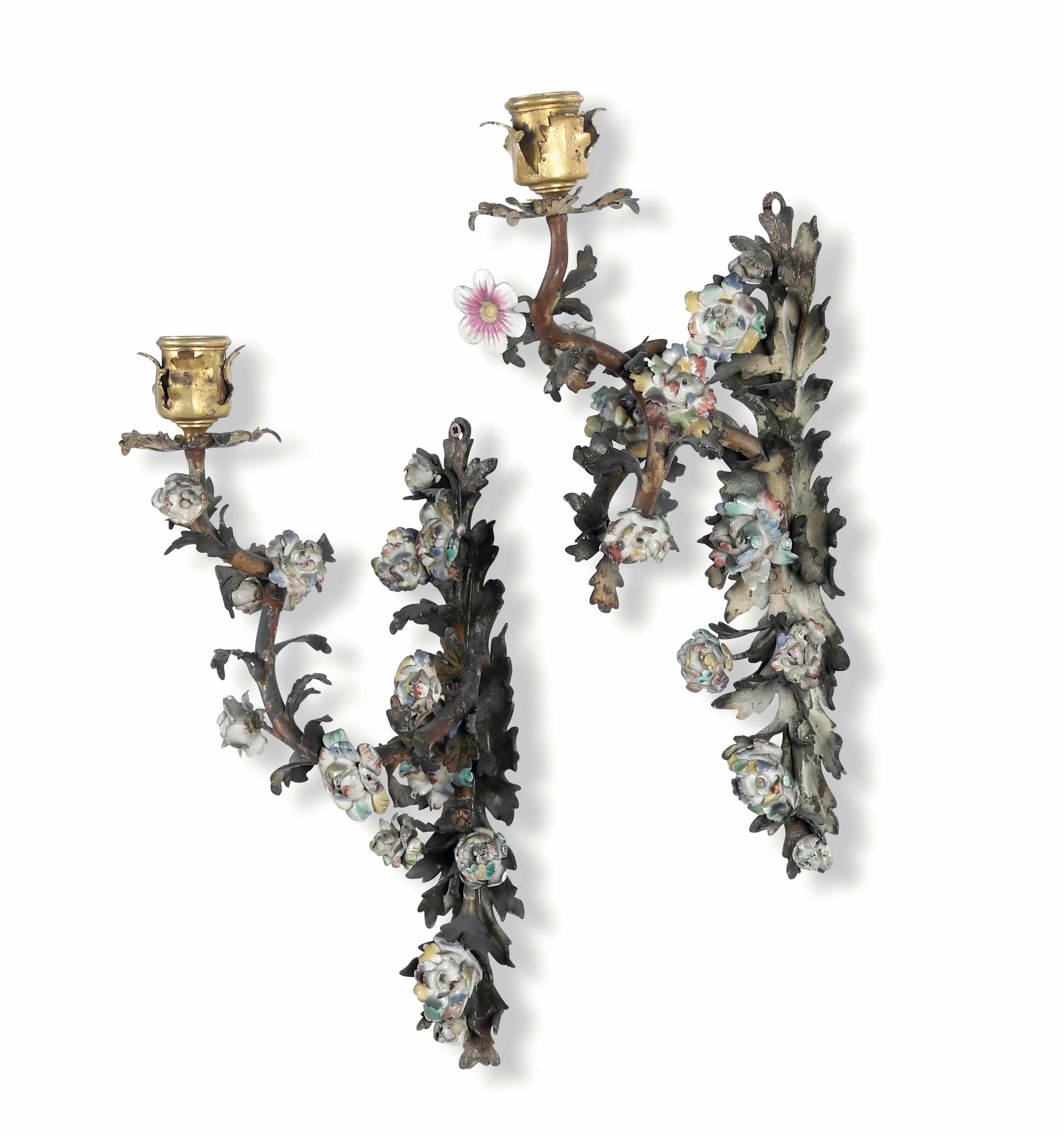 Coppia di piccole appliques in ferro con fiori in porcellana policroma