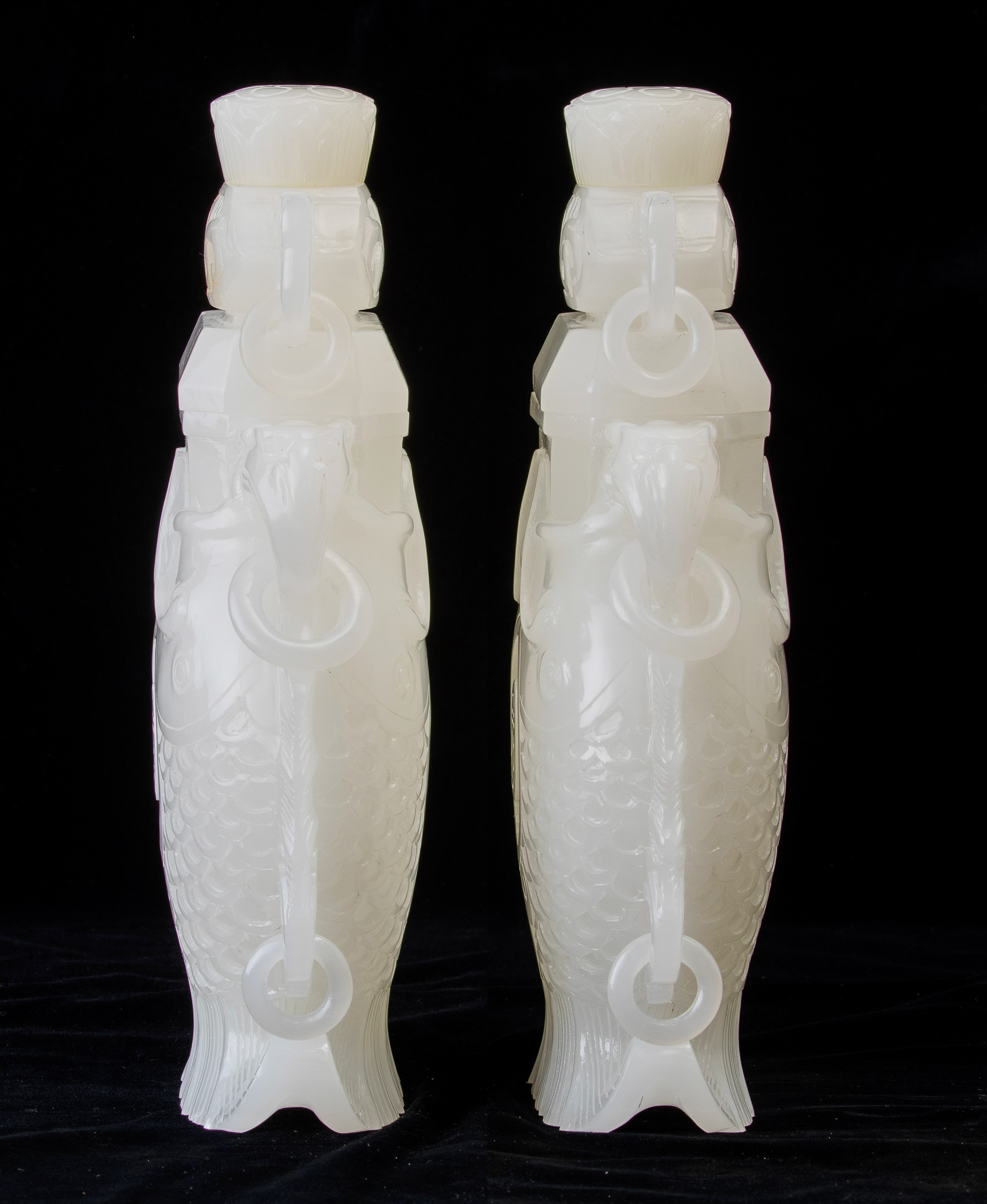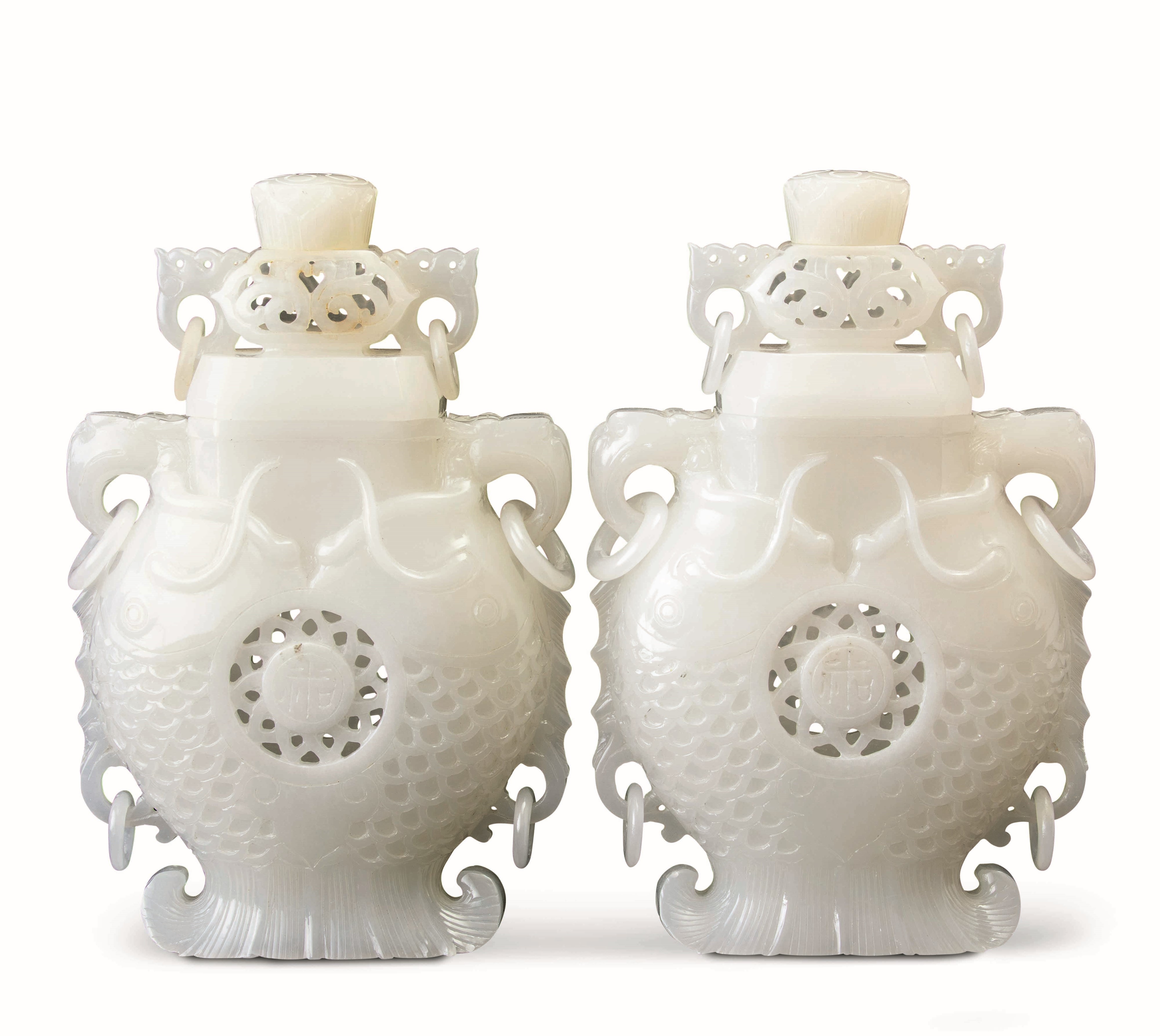 Coppia di vasi con coperchio in giada bianca con decori a traforo, Cina, XX seco [..]