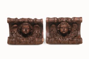 Coppia di fregi in legno scolpito con cherubini. XVII secolo