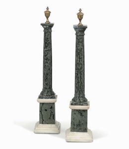 Coppia di colonne in marmo verde e bianco con pinnacoli in legno dorato. XIX sec [..]