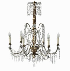 Lampadario Luigi XVI in legno intagliato e dorato e cristalli. XVIII secolo