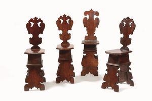 Gruppo di tre sgabelli e uno simile in noce intagliato, probabilmente Toscana, XVII [..]