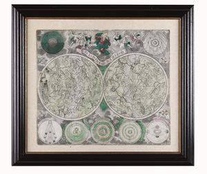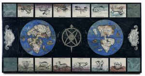 Piano dipinto a tema zodiacale e raffigurante antica mappa del mondo. XX secolo