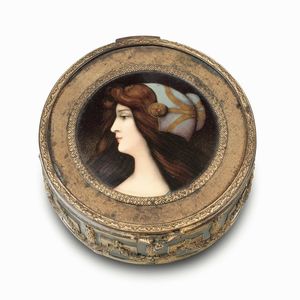 Scatola in vetro e metallo dorato e cesellato centrata da miniatura con profilo [..]