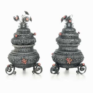 Coppia di bruciaprofumi in filigrana d’argento e corallo. Arte Italiana del XVIII [..]