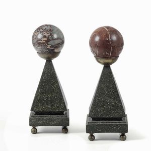 Coppia di sfere in marmo colorato montate su basi piramidali in legno dipinto a [..]