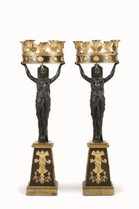 Coppia grandi di candelabri Retour d’Egypte in bronzo dorato e patinato. Toscana [..]